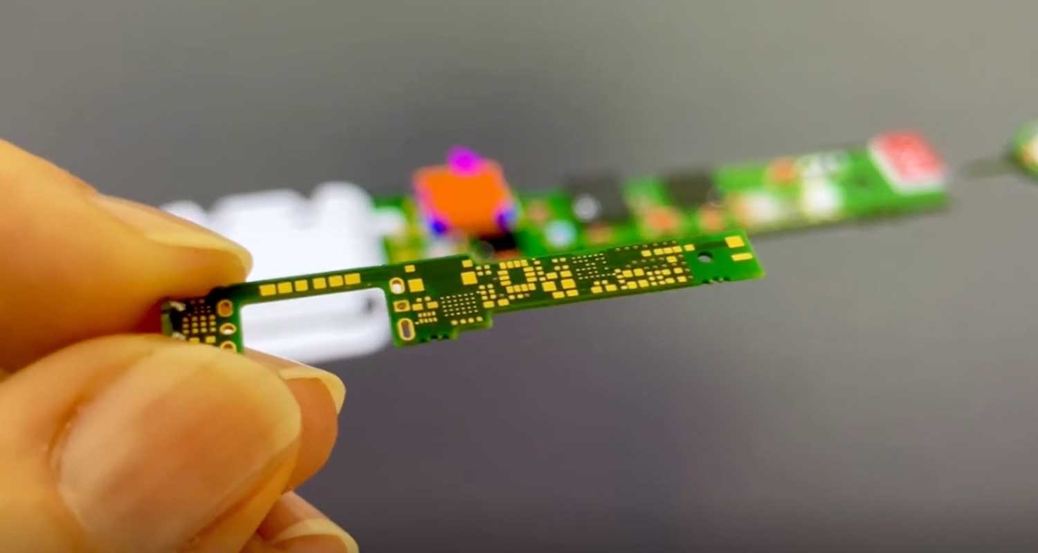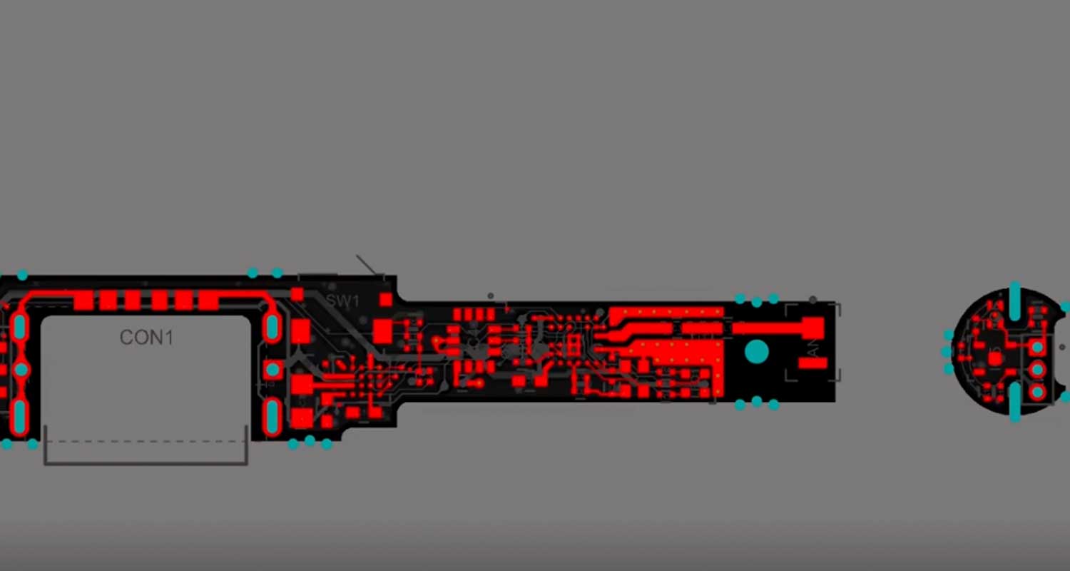 ✍ Die Besonderheit: Alles soll am Ende in einen Kugelschreiber hineinpassen. Eine Leiterplatte im Kleinformat also. Unser Layouter Klaus Hacker hat das Projekt mit Leidenschaft und Expertise betreut und war begeistert am Knobeln. Die größte Herausforderung für ihn war dabei die Miniaturisierung des Layouts und die sehr längliche und schmale Gesamtform (7,4mm an der breitesten Stelle). Her musste eine Lösung, die räumlich minimal, aber technisch noch machbar und dabei preislich hinsichtlich des Serienprodukts vertretbar ist. Umgesetzt wurde dies als 4 Lagen Board, mit 75um Strukturbreiten und vielen Komponenten in Bauform 0201.