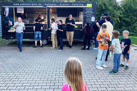 Es gab zuerst Kuchen, danach Köstlichkeiten vom Zebuhof Gath: leckere Burger, Gyros oder Nudeln mit Tomatensauce – für jeden Geschmack war etwas dabei. 🍔 🥙 🍝